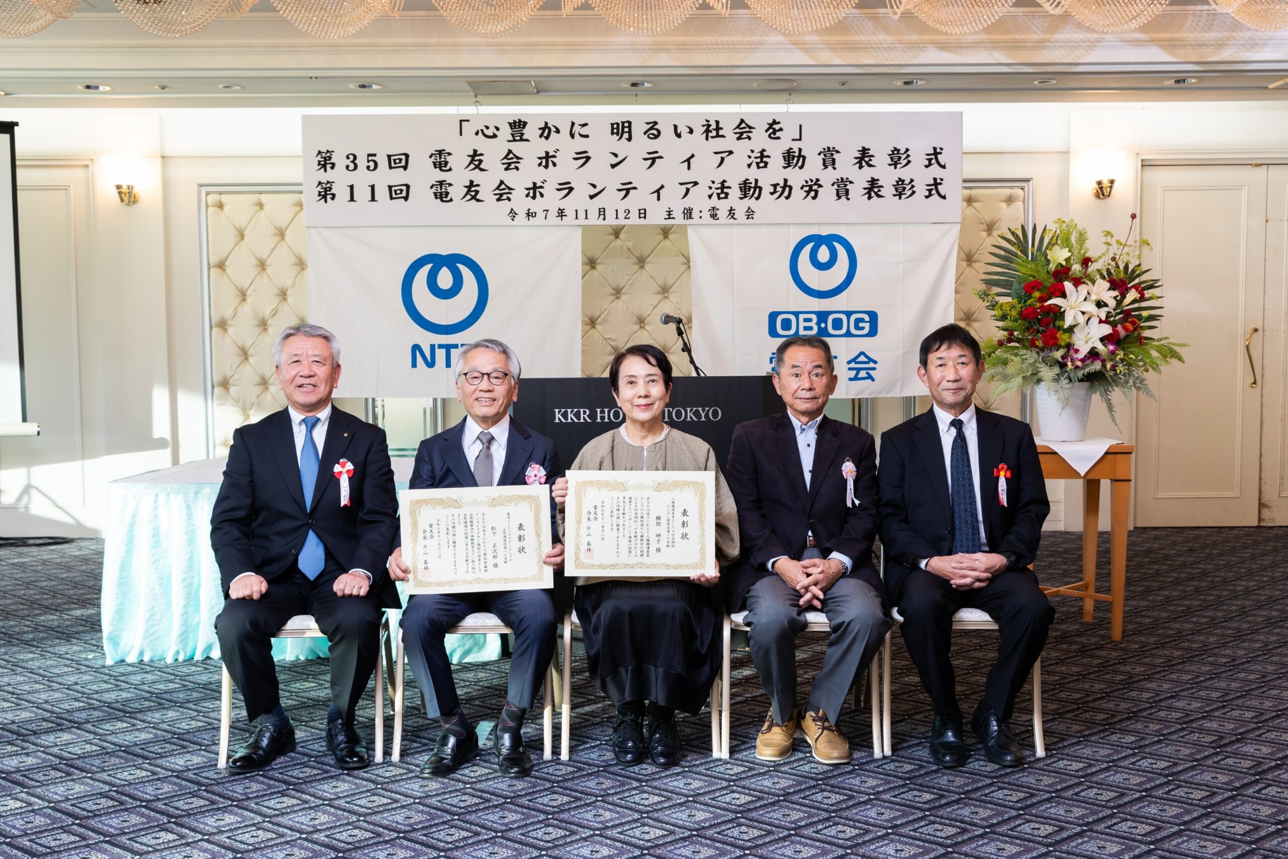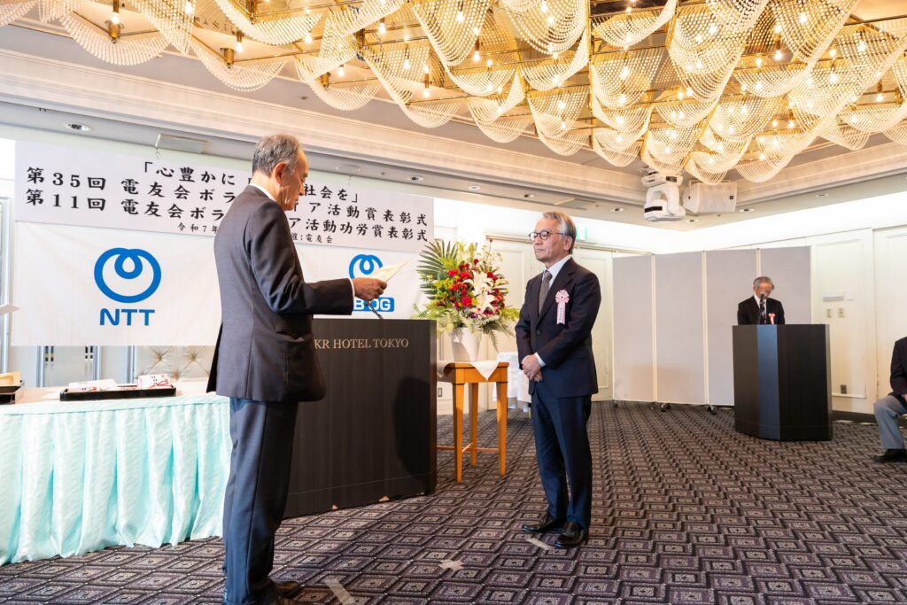令和7年 電友会ボランティア活動表彰式 事務局からのお知らせ 2025.12.26 令和7年11月12日、KKRホテル東京に於いてボランティア活動表彰式が行われ、熊本支部の松下正次郎さんと宮崎支部の櫛間英子さんに表彰状が授与されました。おめでとうございます!