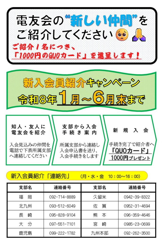新入会員「ご紹介キャンペーン」のお知らせ 事務局からのお知らせ 2026.01.01 会員の皆様へ昨年に引き続き、令和8年1月~6月末において「ご紹介キャンペーン」を実施します。コロナ禍以降は退職説明会等での対面による勧誘活動が出来なくなり、60代の入会数が大変少ない状況です。皆様のお知り合いに未加入の方(仲間)がいらっしゃれば是非一声かけてください。詳細は以下を参照してください。