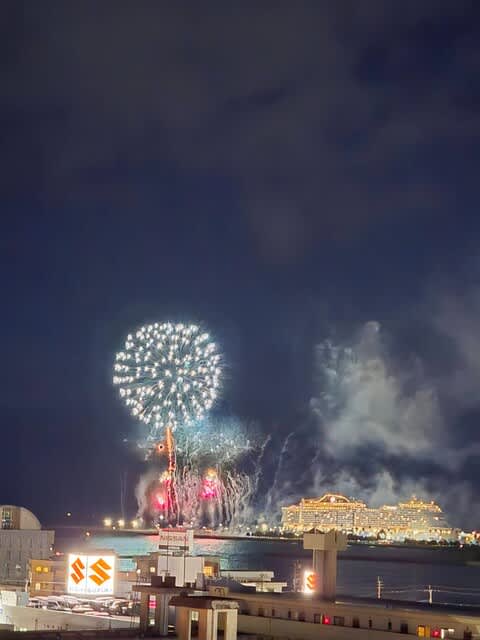 マリンポートに入港したMSCベリッシマのために、花火の打ち上げがありました。