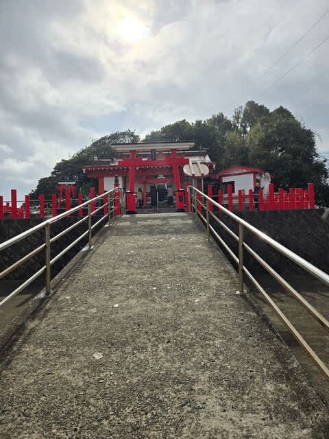 あつい信仰を集めています。薩摩富士開聞岳の北麓に位置し、朱塗りの社殿が周囲の木々の緑に映えていました。