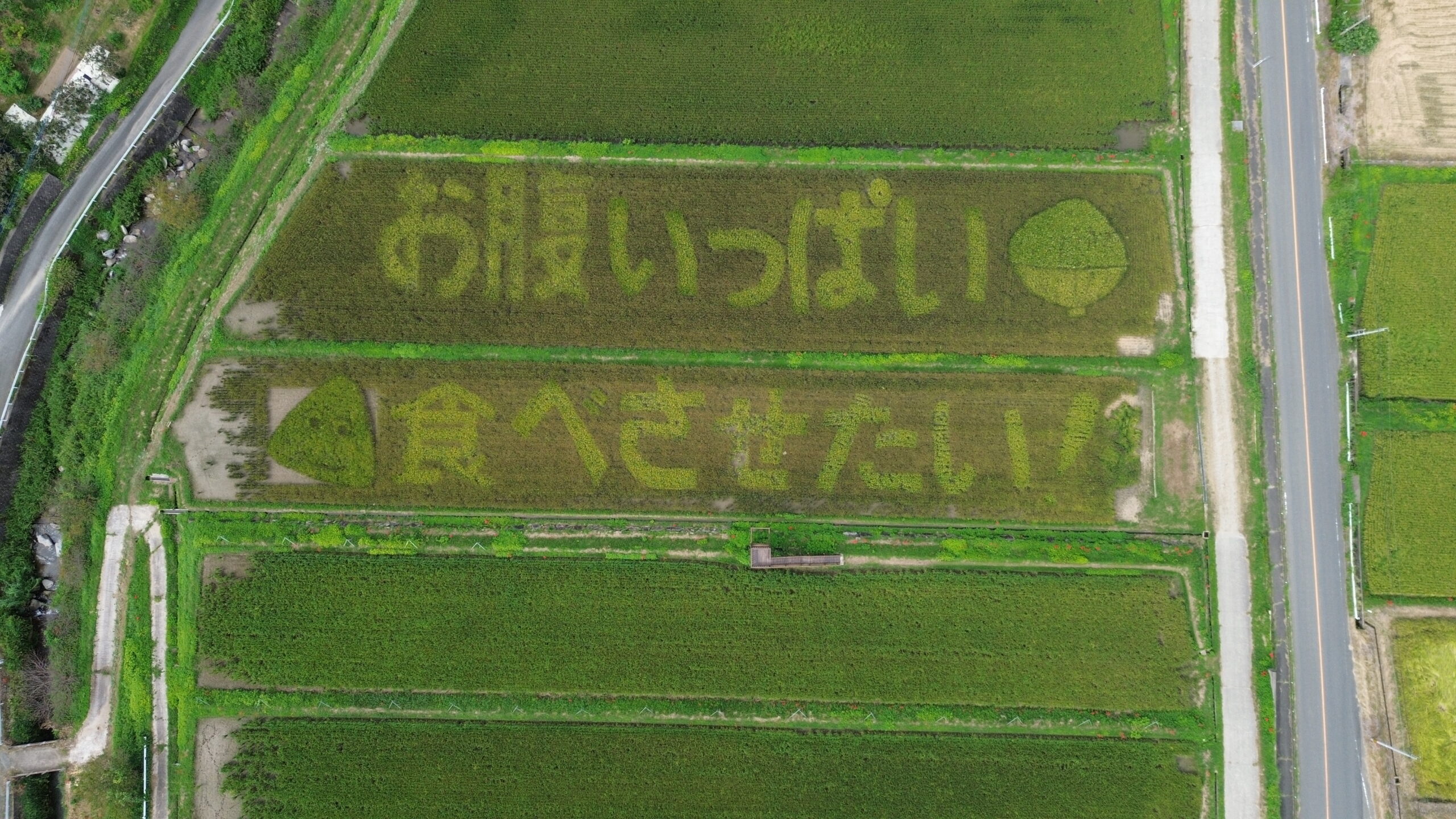 およそ4,000㎡もの田んぼに稲穂が赤くなる「赤米」を混合して植えることによって、文字を田んぼに描いてあります。ドローンの鳥目線(130m)の高さから見ると「お腹いっぱい たべさせたい!」の文字がハッキリクッキリ!!