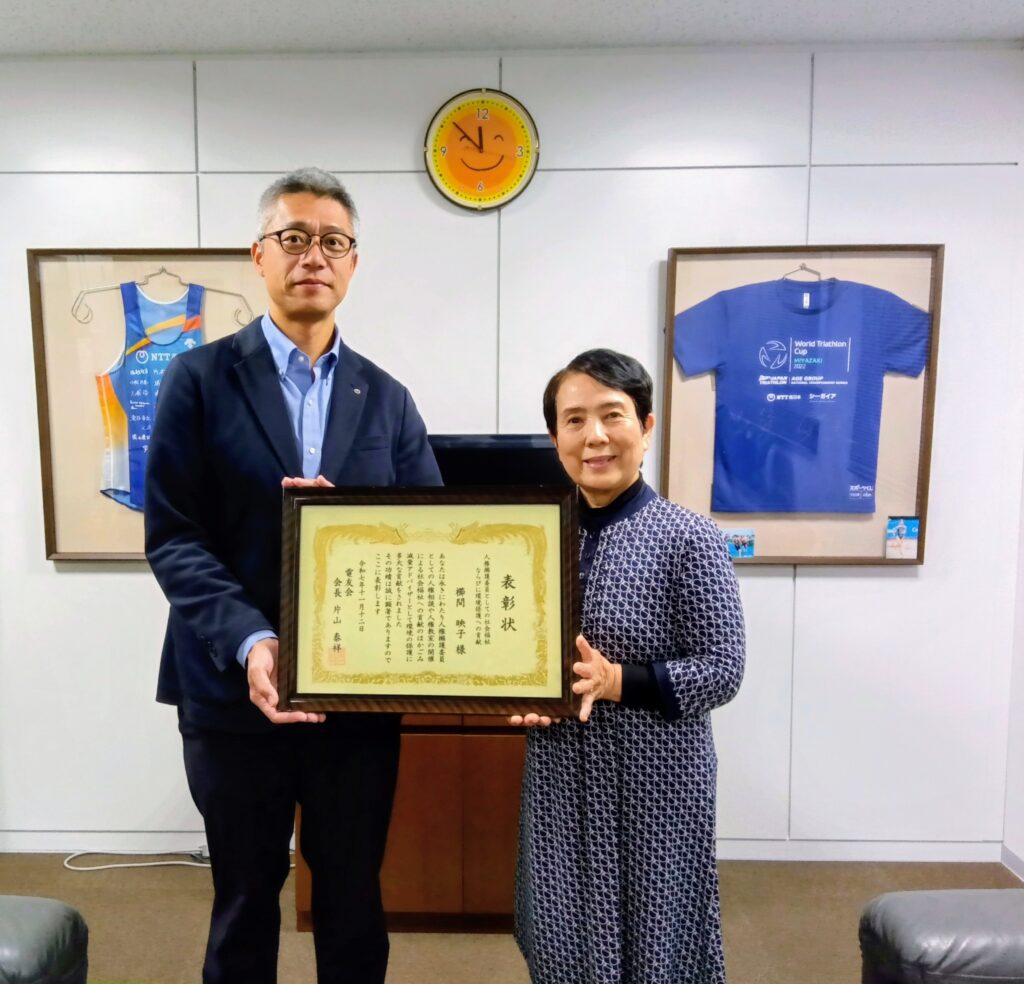 令和7年11月12日(水)東京大手町「KKRホテル東京」10階にて、電友会第35回ボランティア活動表彰式で「ボランティア活動賞」を受賞されました櫛間映子さん(宮崎市)が、令和7年11月19日(水)NTT宮崎支店横奥支店長へ受賞報告を行いました。