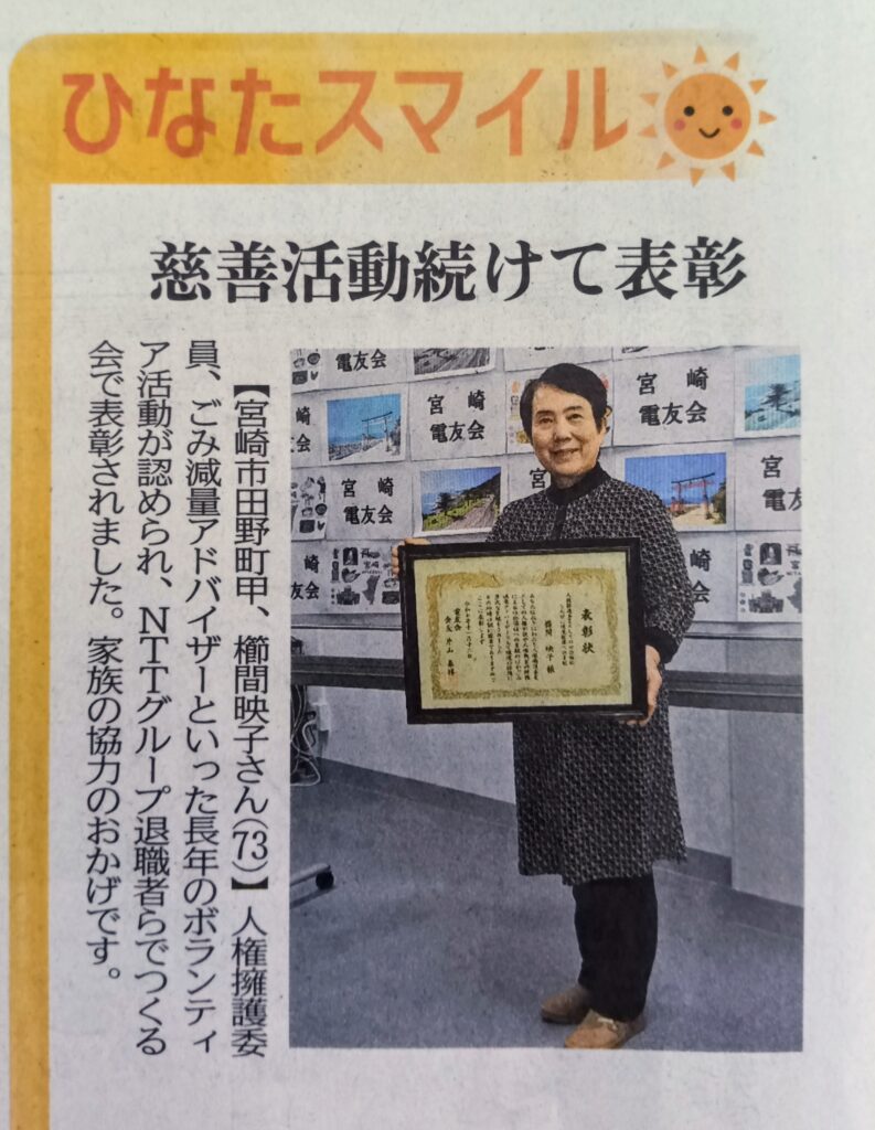 また同年に「NPO法人みやさざきエコの会」を立ち上げ、小学生にごみ減量授業を開始し、平成21年には宮崎市のゴミ減量アドバイザーを委嘱され、各自治会に出向きゴミ分別説明会を開催するなど、多岐にわたり社会福祉に貢献されています。