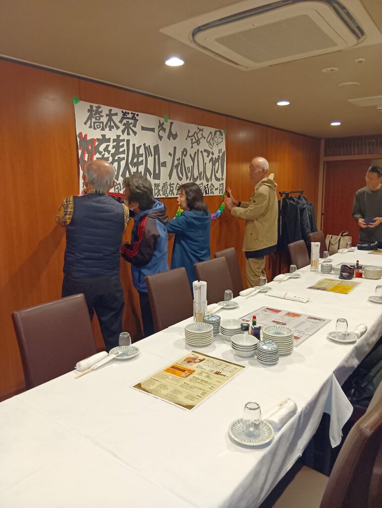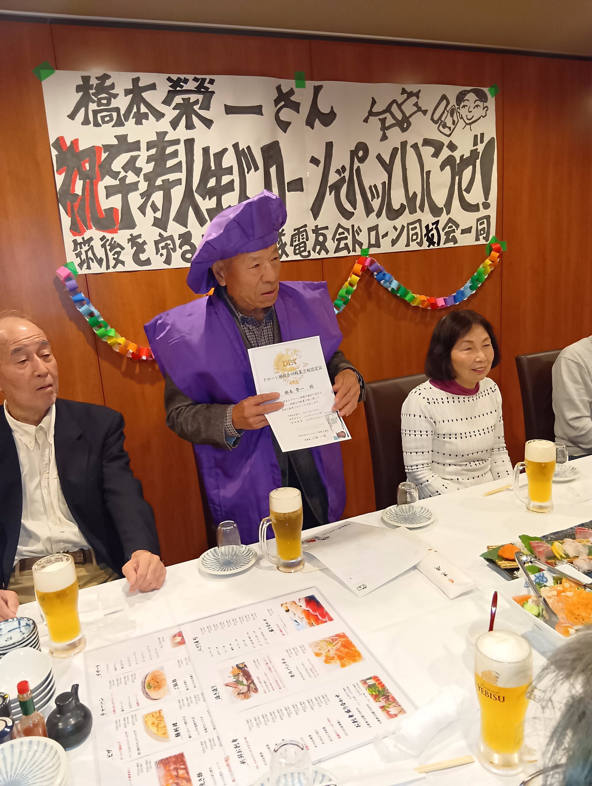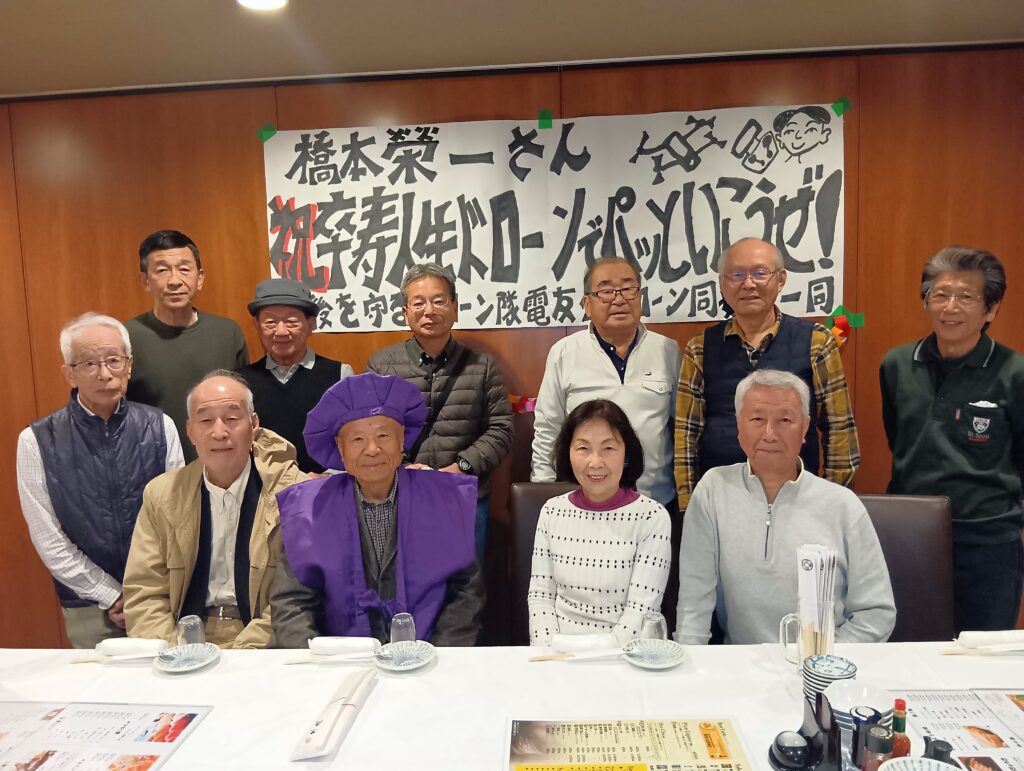 ドローン同好会最長老の橋本さん(90歳 卒寿)のお祝いが令和7年11月23日(土)市内の料亭「寛永通宝」で開催されました。