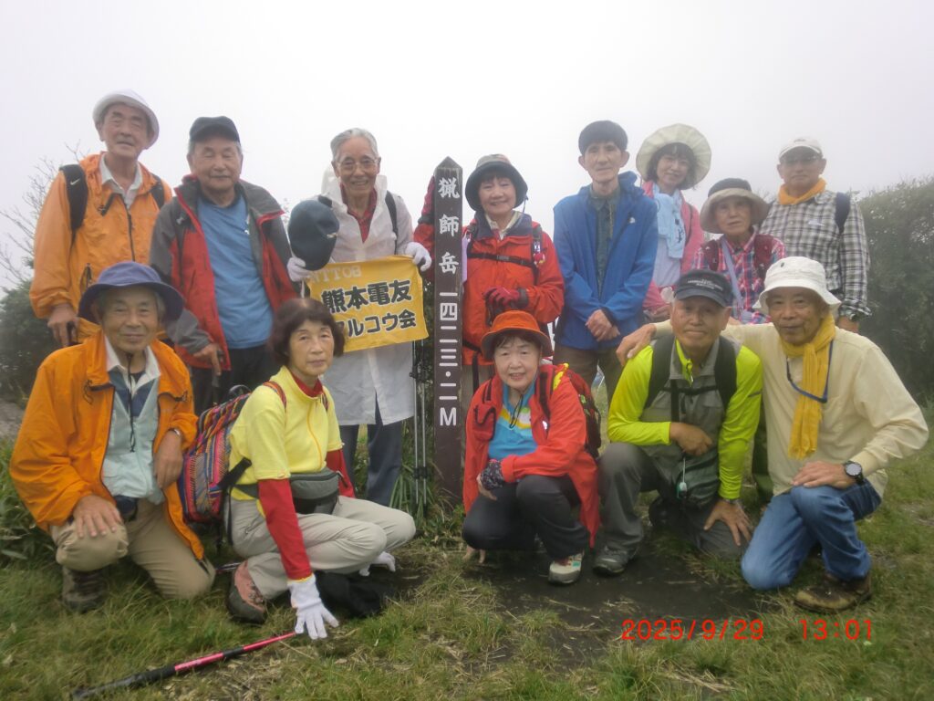 2025年9月29日(月)に、猟師岳を歩きました。参加人数は、14名。熊本市内からは少し遠いため、マイクロバスの貸し切りです。貸し切り運賃も、同じ条件(拘束8時間)での見積もりを7社から入手して比較検討。一番高い見積もりはK社の132,000円、一番低い見積もりがT社の82,500円でしたので、T社の車両を利用することで、計画を立てた次第です。見積依頼した件数が多くなったのは、予算の関係です。9万円以内に抑えることが目標であり、本業がタクシー会社でもあることから、安心して契約できました。計画どおりに、熊本市民会館前を午前9時に出て牧ノ戸峠登山口の手前にある駐車場に午前11時30分に着く。その後、全員で柔軟体操をしてから登山開始。山路は見晴らしもよく、道迷いする場所もないため気持ちのよい登山ができました。今回の参加者の中には、今年94歳になるメンバーが足取りも確かで先頭を歩かれており、大いに励まされました。