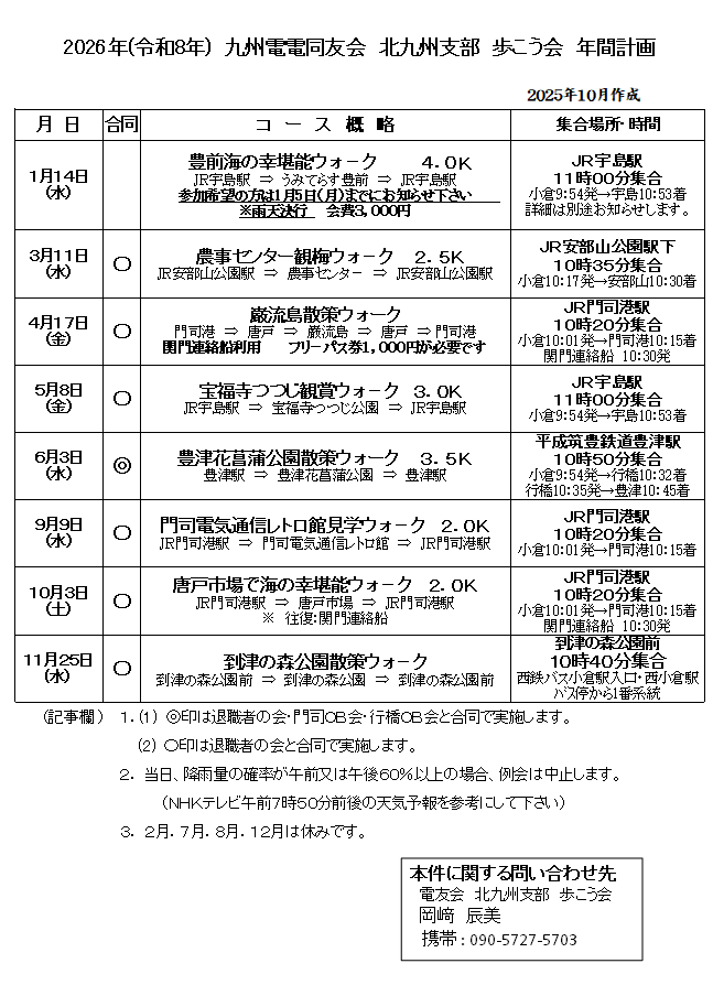 3月11日(水)、少し肌寒い朝でしたが、JR安部山公園駅に集合し、「農事センター観梅ウォーク」を退職者の会と合同で行いました。参加者は19名。元気にスタートし、春の気配を感じながら農事センターへ向かって歩きました。農事センターに到着後は、園内の梅を観ながらゆっくりと歩きました。残念ながら梅は見頃を過ぎていましたが、枝に残る花を眺めながら歩くのもまた風情があり、自然と会話も弾みました。その後は皆でお弁当を広げて楽しい昼食タイム。和やかな雰囲気の中で交流も深まり、笑顔の多いひとときとなりました。今回も元気に歩き、心地よい一日を過ごすことができました。次回の例会は「巌流島散策ウォーク」です。4月17日(金)10時20分、JR門司港駅集合です。皆さまのご参加をお待ちしています。春の風を感じながら、また皆さんと元気に歩けることを楽しみにしています。