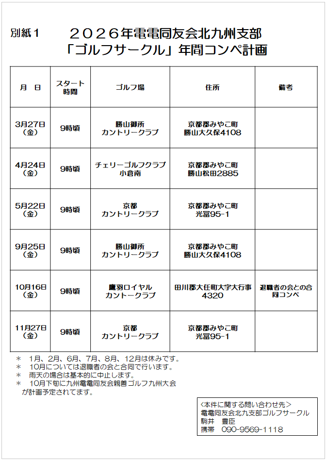 2026年 北九州支部 ゴルフサークル 年間コンペ計画